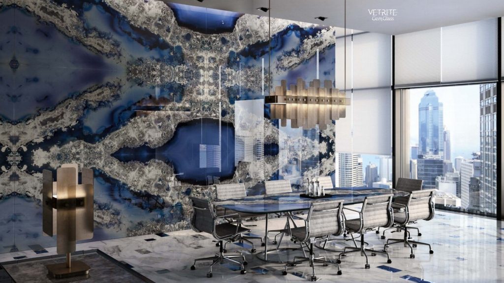 Oggi sono anche disponibili i rivestimenti in lastre di vetro di grandi dimensioni dai colori incantevoli, in grado di evocare atmosfere suggestive, gli effetti cromatici delle pietre preziose, del marmo, di paesaggi da sogno, con finiture a specchio o trasparenti, traslucide o opache.